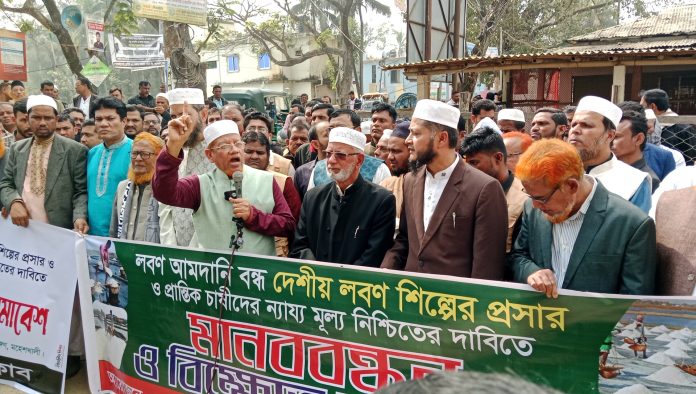 ব্যানার ও প্ল্যাকার্ড হাতে তারা লবণ আমদানির সিদ্ধান্ত বাতিল, দেশীয় লবণের ন্যায্যমূল্য নিশ্চিত এবং চাষিদের জন্য বাজার সুরক্ষা ব্যবস্থা চালুর দাবি তোলেন।